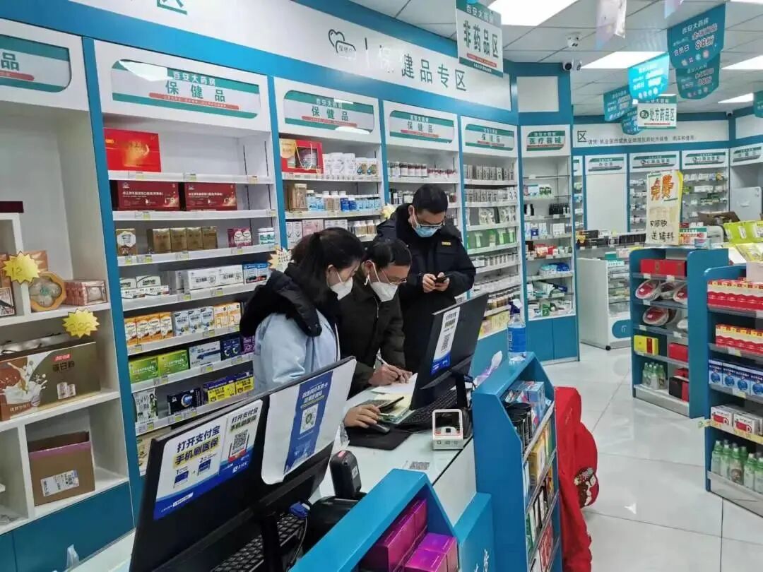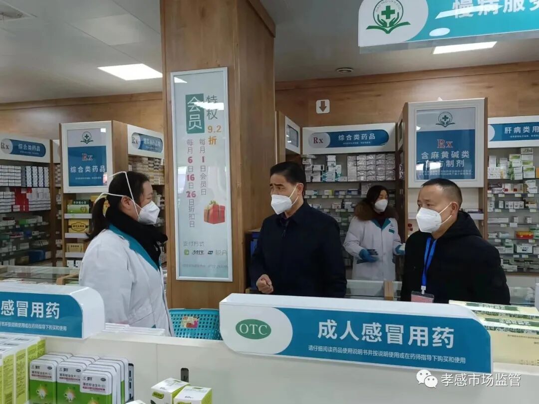 12月21日上午,孝感市市场监管局先后检查了城区黎明大药房长征二路店、城站路国药商场、益丰城站路药店、晓琳城站药店、绿茵大药房、城东大药房等6家零售药店,重点询问了“四类”药品及新冠病毒抗原检测试剂购销情况,详细了解当前部分药品短缺情况,督促药企负责人组织好货源,加强药械质量管控,严格落实明码标价制度,引导群众科学合理购药。