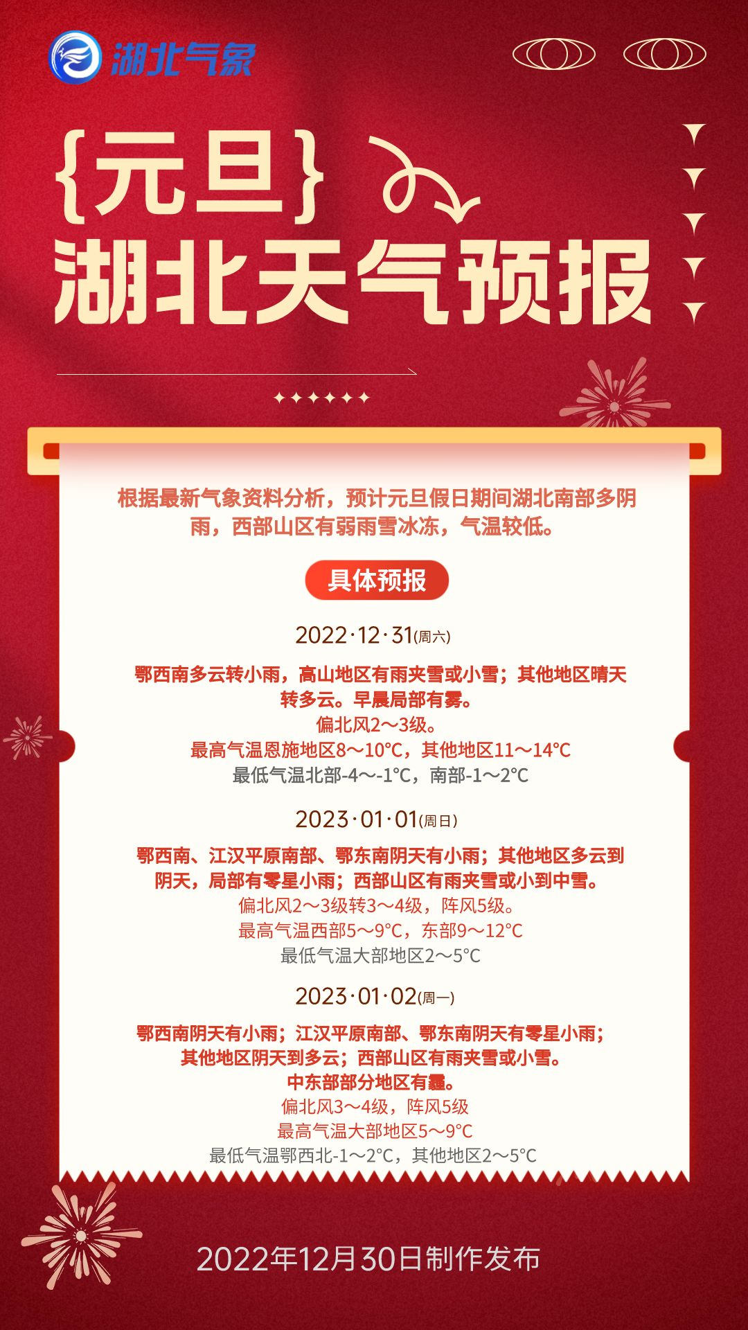 元旦假日期间(12月31日—1月2日)湖北省南部多阴雨,西部山区有弱雨雪冰冻,气温较低。建议公众做好防寒保暖和健康防护,注意用电取暖安全;合理安排出行计划,出行时注意交通安全,防范雾或霾等低能见度天气、道路湿滑、山区积雪结冰的不利影响。