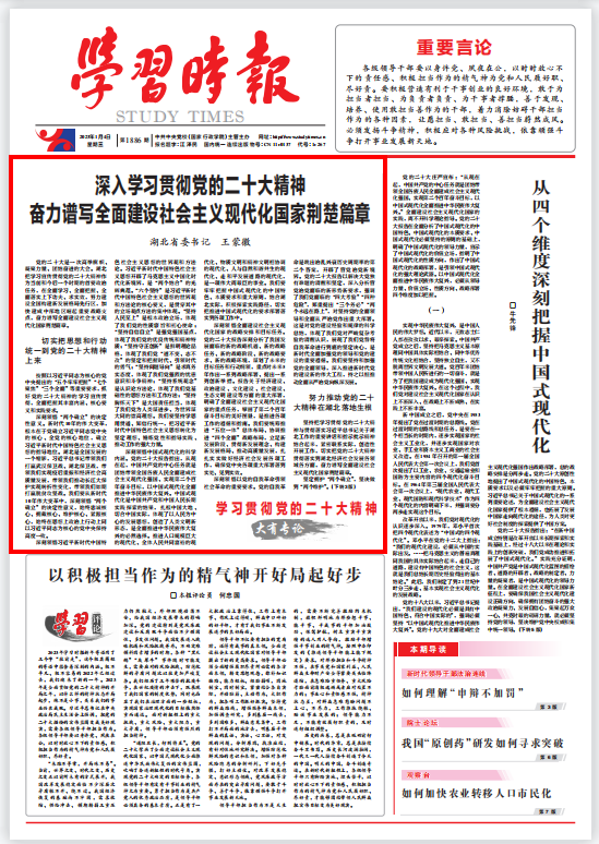 《学习时报》2023年1月4日头版头条刊发湖北省委书记王蒙徽同志的署名文章《深入学习贯彻党的二十大精神 奋力谱写全面建设社会主义现代化国家荆楚篇章》,全文如下: