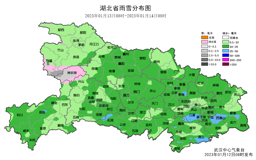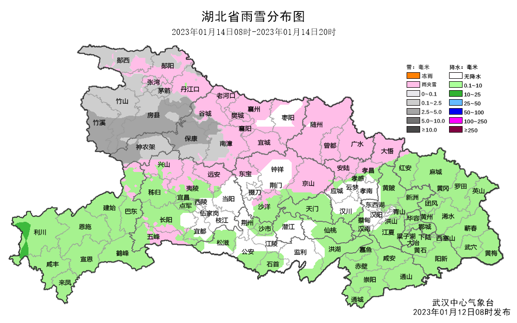 鄂东北东部、鄂东南阴天有小到中雨,局部大雨,并伴有弱雷电;鄂西北、江汉平原北部、鄂东北西部小雨转雨夹雪或小雪,山区中到大雪;其他地区阴天有小雨。