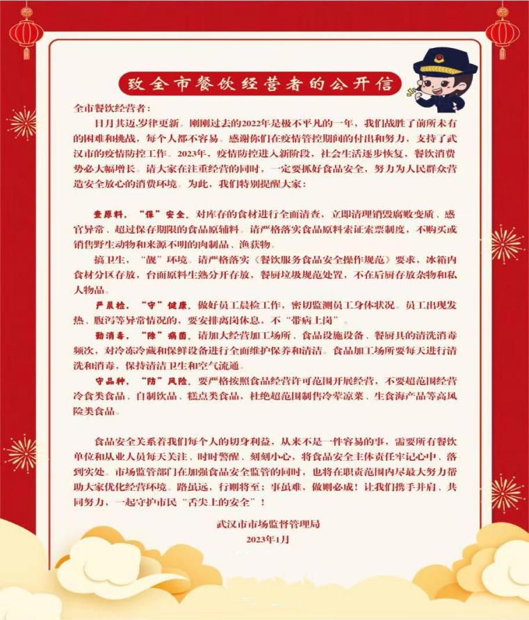 武汉市市场监管部门在组织开展节前食品安全监督检查和风险隐患排查的同时,发布《致全市餐饮经营者的公开信》,督促餐饮服务企业落实食品安全主体责任。