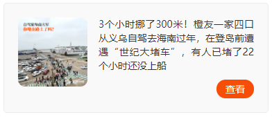 1月14日,浙江橙友陈先生一家四口自驾去海南过年,在登岛前遭遇“世纪大堵车”,快到海口时,3个小时挪了300米。有网友说“感觉全国一半的人都去了海南”。