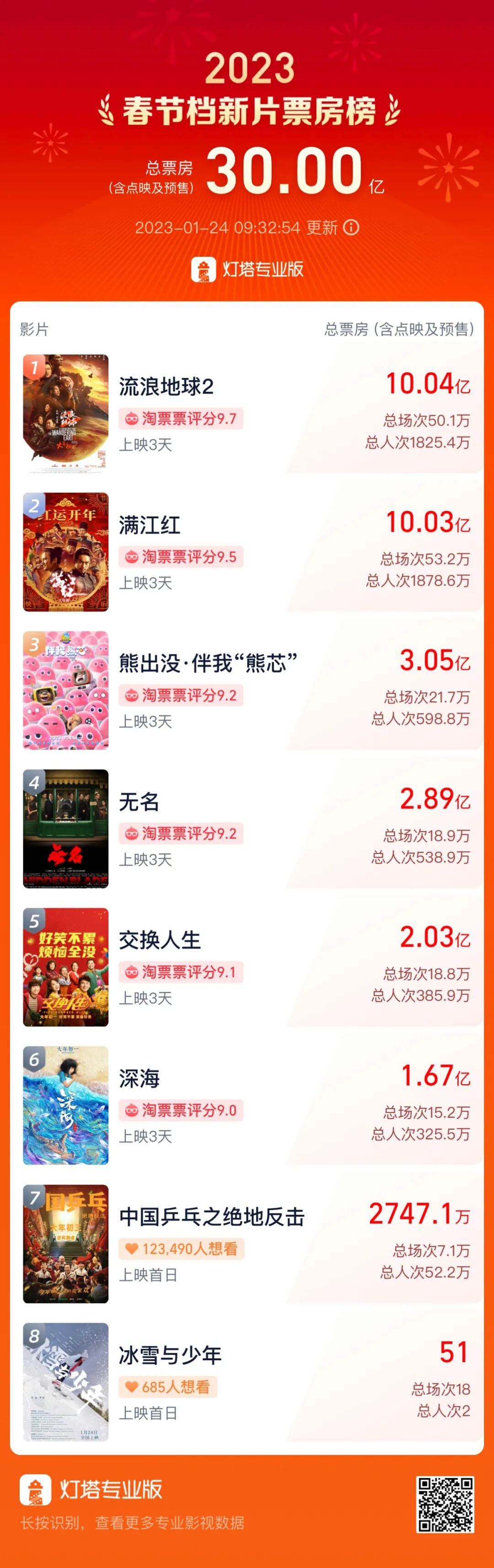 据灯塔专业版实时数据2023春节档(1月21日-1月27日)总票房(含预售)突破30亿票房前三分别为《流浪地球2》《满江红》《熊出没·伴我“熊芯”》其中