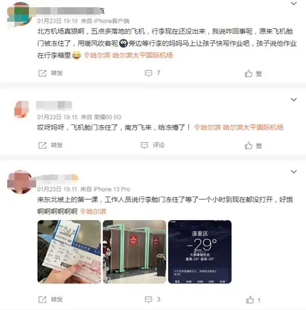 1月23日,多名网友发文称,乘飞机抵达哈尔滨时,飞机舱门被冻住了行李拿不出来。
