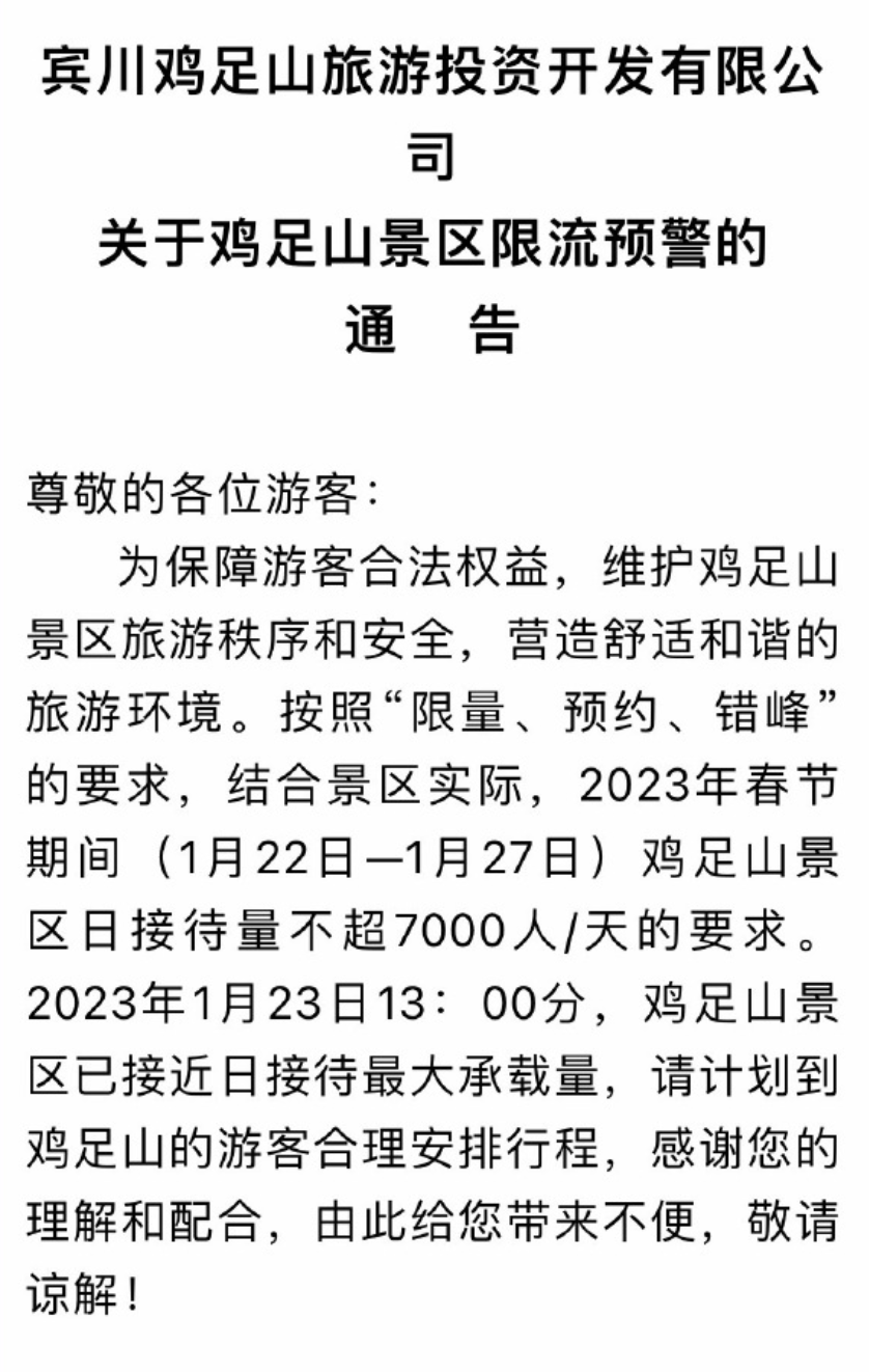1月23日,@大理文旅发布厅 转发通告,宾川鸡足山景区限流预警!