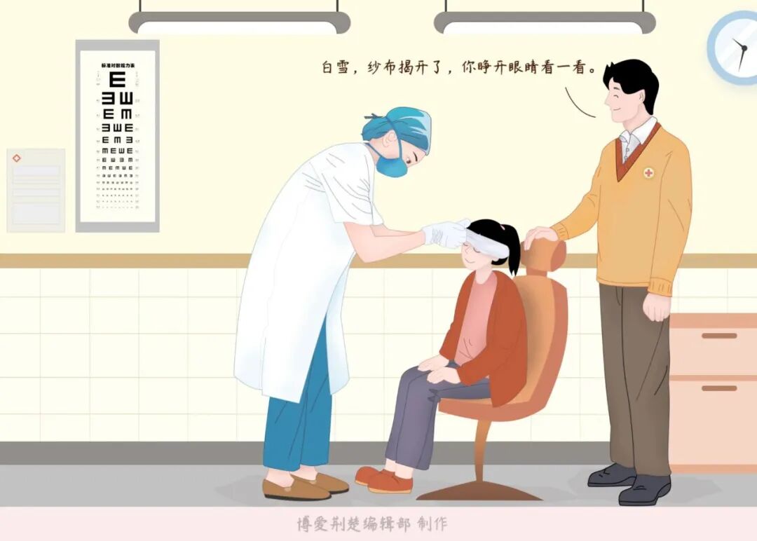 我缓缓地、小心地试着睁开双眼,曾经只能看见亮、看不清东西的我,依稀看到了眼前目光善良的中年男子,很快,对方的轮廓愈发清晰、立体、真实。我瞬间激动起来,噙着泪低声抽泣,一会儿,又喜悦地笑了。