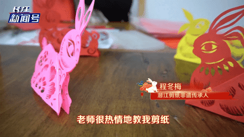 但是,让他最兴奋的是,他还拜师潜江剪纸非遗传承人程冬梅,学会了剪兔子的手艺。