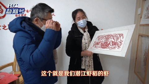 还收到了程冬梅老师,赠送给他的新年礼物,潜江最有名的剪纸代表作品—稻香肥虾。