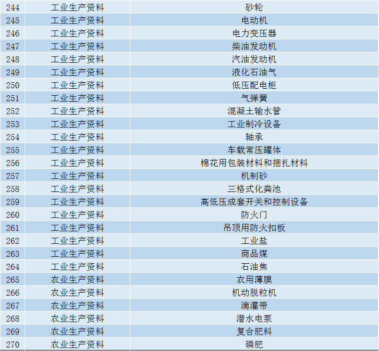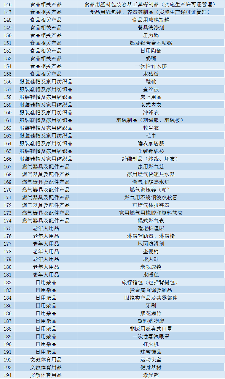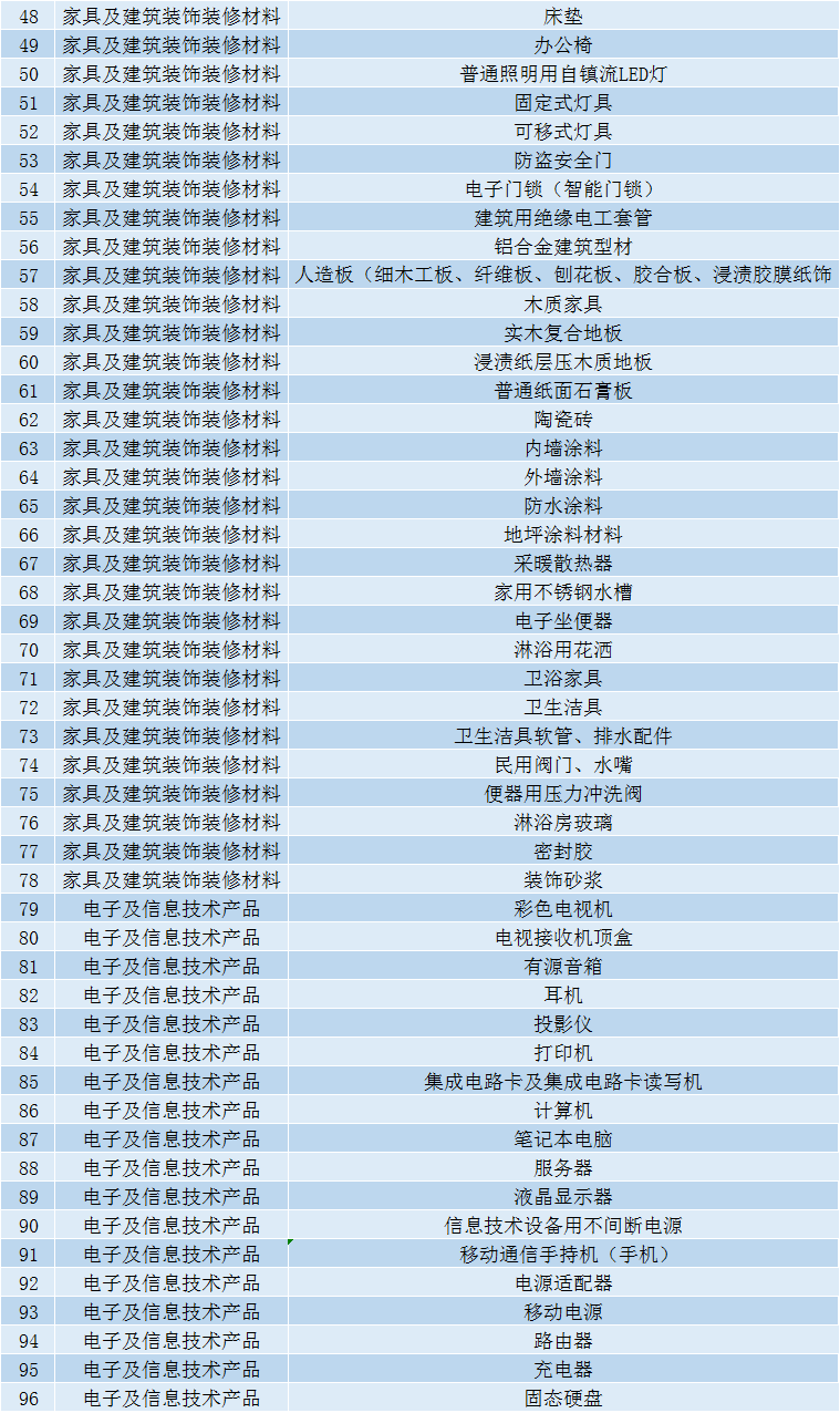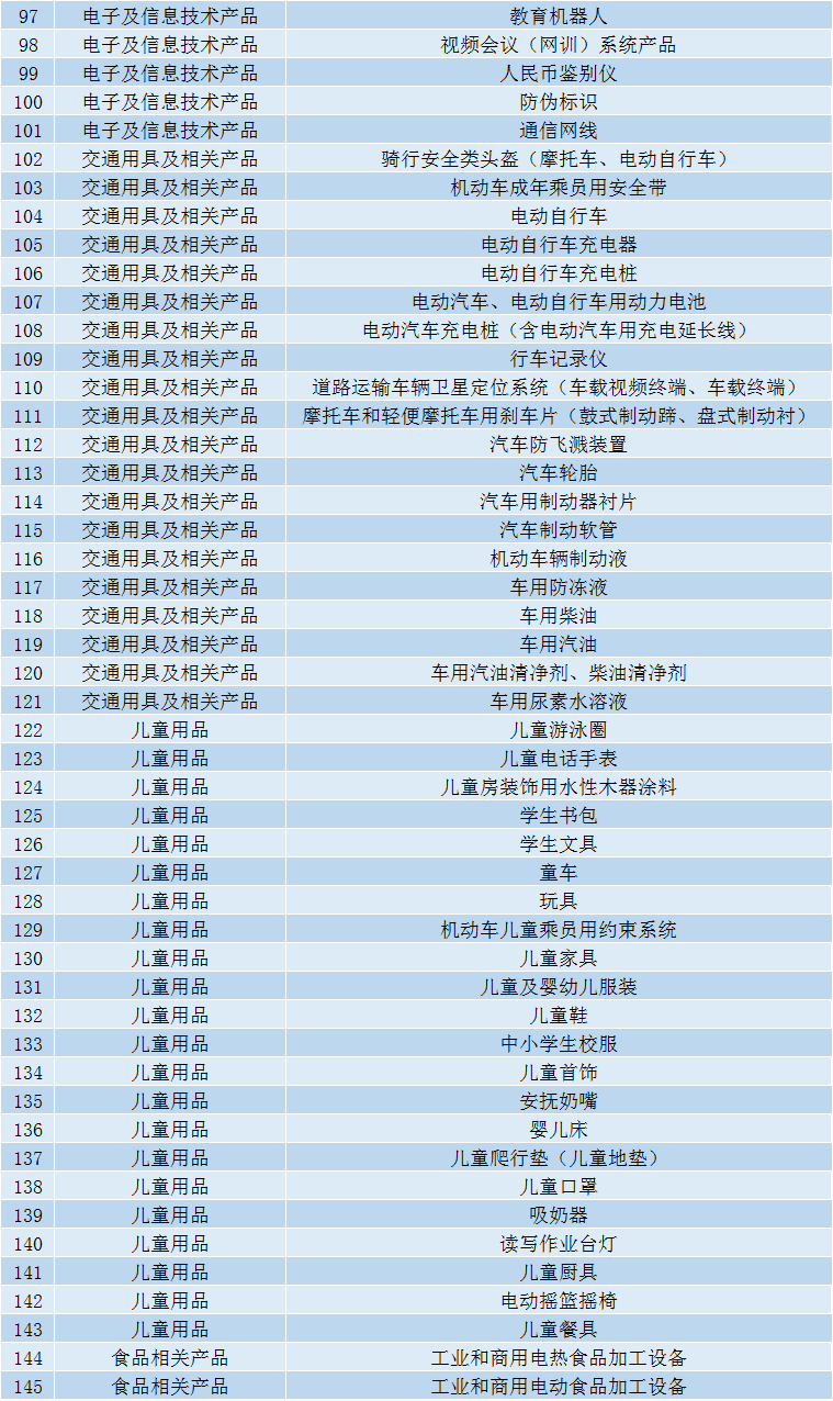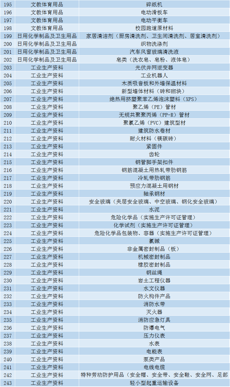 家用电器及电器附件、家具及建筑装饰装修材料、电子及信息技术产品、交通用具及相关产品、儿童用品、食品相关产品、服装鞋帽及家用纺织品、燃气器具及配件产品、老年人用品、日用杂品、文教体育用品、日用化学制品及卫生用品、工业生产资料、农业生产资料等14类270种产品。