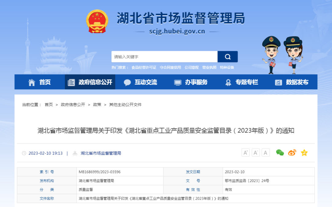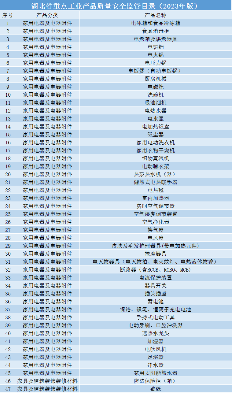 《湖北省重点工业产品质量安全监管目录(2023年版)》发布