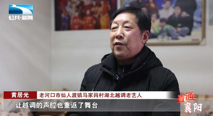 老河口市仙人渡镇马家岗村湖北越调老艺人 黄居光:“2016年,当时剧团的领导与有关人员找到我,我们一起到马家岗去采访了很多老艺人,在那里学习越调的唱腔、配乐,回来以后,老河口市越调剧团就成立了,让越调的声腔也重返了舞台。”