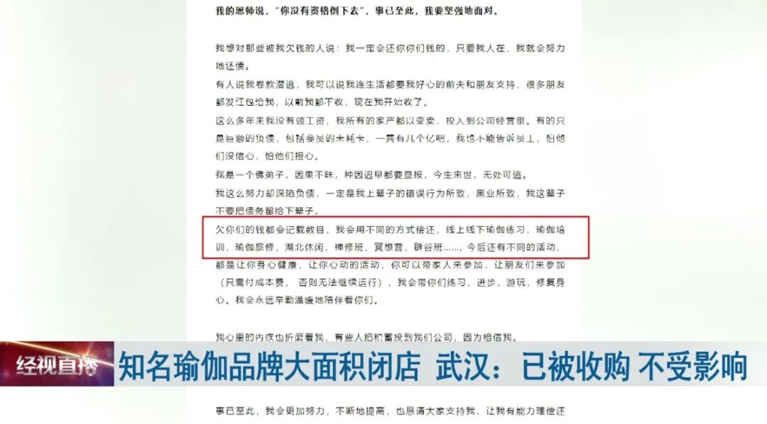 对此,梵音瑜伽微信公众号2月26号发文表示,老板个人所有家产已变卖,不得已停业整顿,欠的钱会用不同方式偿还。