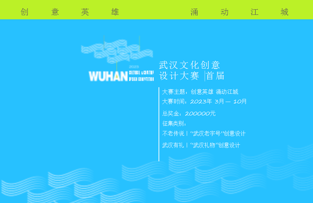 “创意英雄 涌动江城”2023首届武汉文化创意设计大赛,由中共武汉市委宣传部、武汉市商务局、武汉市文化和旅游局共同主办,旨在推进文化创意IP赋能实体经济,促进文化创意深度融入城市生产生活,进一步提升城市文化软实力,打造文化繁荣的新时代英雄城市。本届主要面向全社会征集“武汉老字号”和“武汉礼物”系列创意设计,其中“武汉老字号”创意设计类别征集包括“武汉老字号”组合礼盒及伴手礼创意设计、“武汉老字号”品牌IP创意设计、“武汉老字号”媒体宣传策划案、“武汉老字号”店面空间场景设计、“武汉老字号”产品创新概念设计等方面;“武汉礼物”创意设计类别的征集则涵盖“武汉礼物”文创IP形象设计、“武汉礼物”城市文创产品设计、“武汉礼物”创意符号视觉设计等方面。
