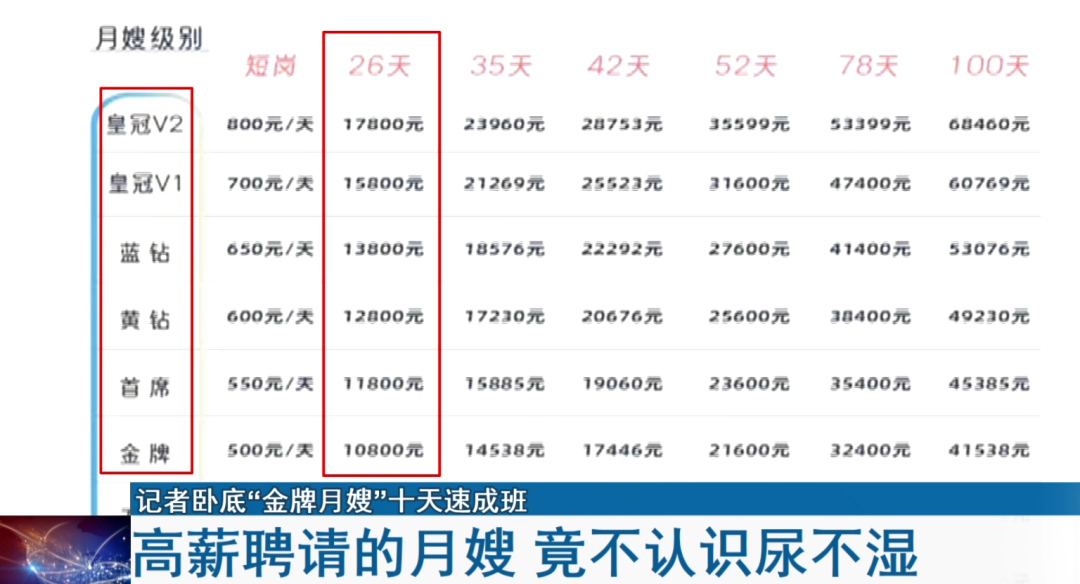武汉炎黄家政科技有限公司月嫂资费表显示,月嫂级别从金牌级起步,依次还有首席、黄钻、蓝钻、皇冠v1、皇冠v2等6个级别,26天的服务费用在10800元至17800元之间。