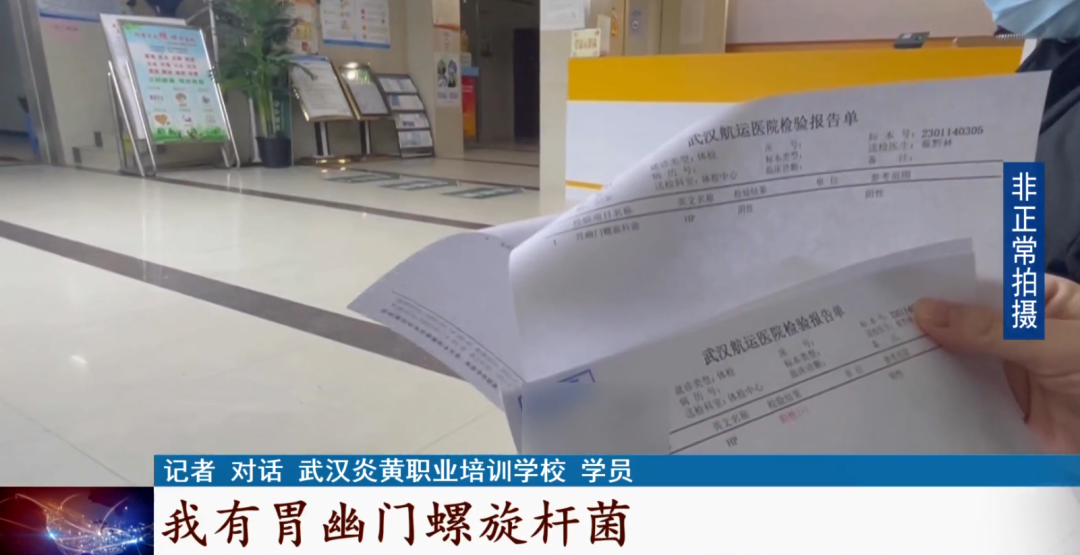 随后,武汉炎黄职业培训学校组织学员到医院参加体检,结果显示,多人的胃幽门螺旋杆菌检测呈阳性。