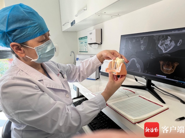 2月28日,海南口腔医院数字化种植中心副主任、主任医师韩素勤给患者讲种植牙的情况。新海南客户端 图