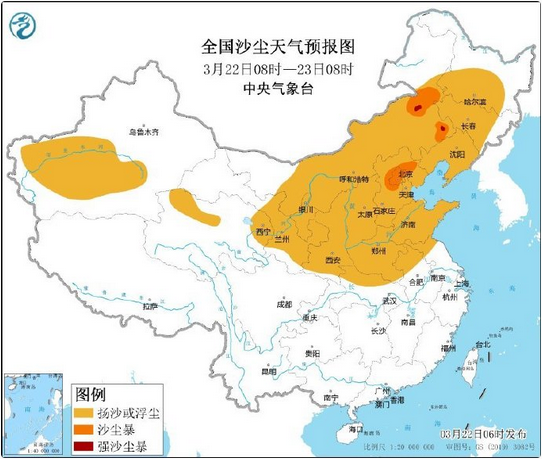 受冷空气大风影响,预计3月22日08时至23日08时,新疆南部、青海北部、甘肃中南部、宁夏、内蒙古大部、陕西大部、山西、河北、北京、天津、黑龙江中西部、吉林中西部、辽宁、山东、河南、江苏北部、安徽北部、湖北北部等地的部分地区有扬沙或浮尘天气,其中,内蒙古东南部、北京、天津北部、河北中北部等地的部分地区有沙尘暴,局地有强沙尘暴。