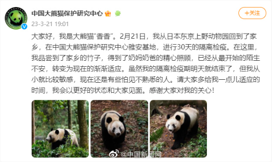 3月21日,@中国大熊猫保护研究中心发文:“大家好,我是大熊猫‘香香’。2月21日,我从日本东京上野动物园回到了家乡,在中国大熊猫保护研究中心雅安基地,进行30天的隔离检疫。在这里,我品尝到了家乡的竹子,得到了奶妈奶爸的精心照顾,已经从最开始的陌生不安,转变为现在的渐渐适应。虽然我的隔离检疫期明天就结束了,但我从小就比较敏感,现在还是有些怕见不熟悉的人。请大家多给我一点儿适应的时间,我会以更好的状态和大家见面。感谢大家对我的关心! ”网友:在碧峰峡打滚儿的香香好像变“脏”了一丢丢!