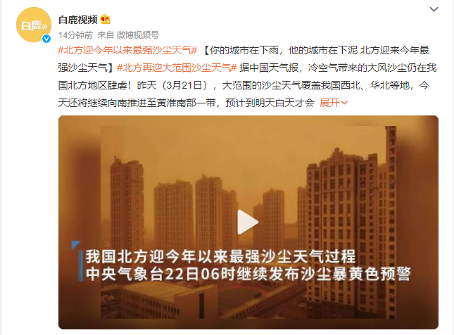 北方迎今年以来最强沙尘天气:你的城市在下雨,他的城市在下泥