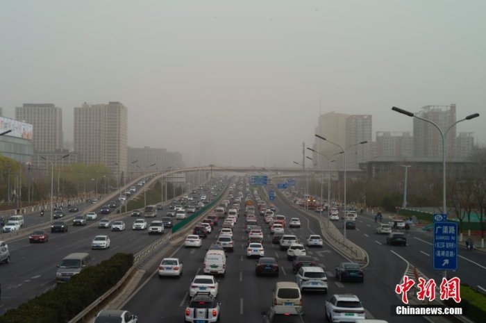 北京市气象台3月22日05时40分升级发布沙尘暴黄色预警信号。图为当日上班早高峰,北京市已出现明显沙尘天气。中新社记者 盛佳鹏 摄