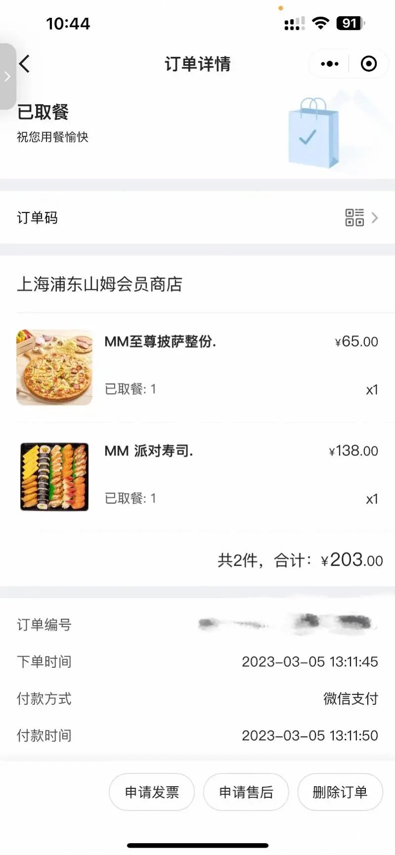张小姐告诉记者,她和她的朋友们是3月5日下午1点,在上海浦东山姆会员商店购买了披萨和寿司。根据其提供的购买凭证,她们购买的寿司名称为“MM 派对寿司”的海鲜寿司,售价138元。