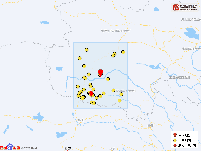 历史地震:根据中国地震台网速报目录,震中周边200公里内近5年来发生3级以上地震共47次,最大地震是2022年8月14日在青海玉树州杂多县发生的5.9级地震(距离本次震中151公里),历史地震分布如图。
