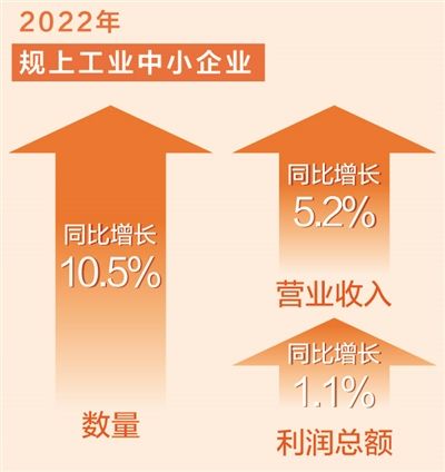 2022年全年规上工业中小企业数量、营业收入、利润总额同比分别增长10.5%、5.2%和1.1%。工信部对4.3万家中小企业调查显示,2022年近四成企业有新增贷款,超六成企业有研发投入,超六成企业有固定资产投资,企业发展信心不断增强。