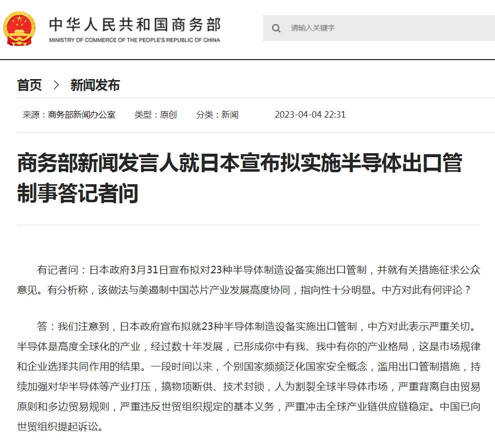 日本宣布拟实施半导体出口管制,商务部:望日方听取理性声音