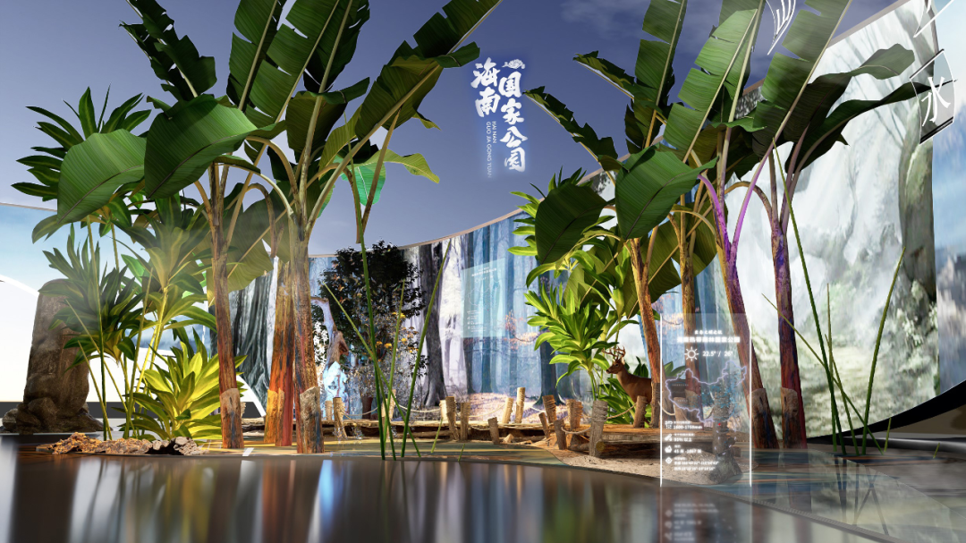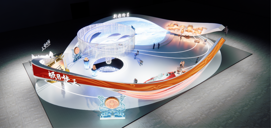 展馆内搭建云海茶园、天涯海角、椰林沙滩、虎山长城等实景或半景画置景;多媒体影像展现福建土楼、亚龙湾、可可西里、长白山、青城山、都江堰、大九湖等著名地标景点;还有船歌互动《乌苏里江》、天空之境打卡等沉浸场景体验。展馆囊括科技体验最新成就,通过“光”与半透薄幕的配合,创造入画式观展感受。在馆内,圈形屏、数控等科技手段与楚文化故事结合,让屈原与航天员跨越时空对话,演绎未来版《天问》。