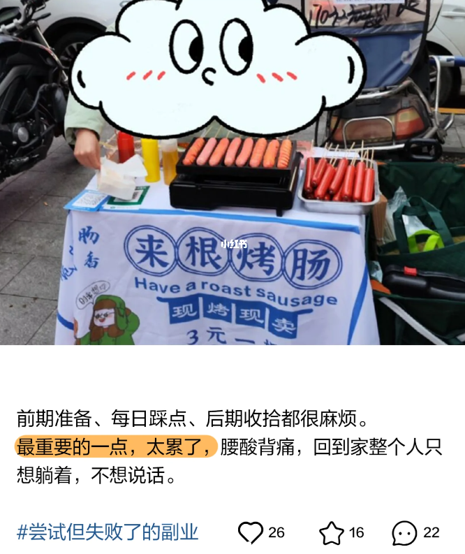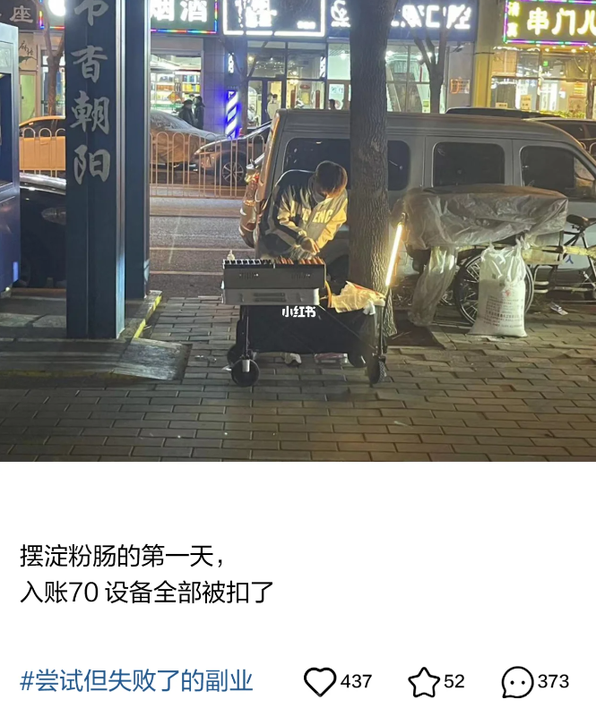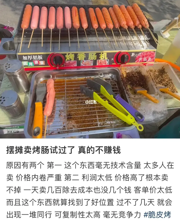 一网友在小红书上分享了自己的“惨痛”经历,“4点到摊位,是在附近的一个热门公园,刚到门口就看到五家烤肠摊,我直接震惊住了。上个礼拜来的时候就两家同行在这摆,现在直接多了三个竞争对手,然后我果断换了一条路,找了一条没同行的路,但是也花了半小时才卖出去第一单。”