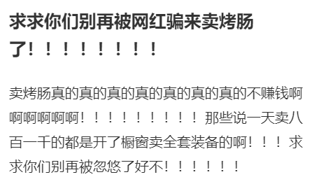一位二十多岁的宝妈辞职后卖了一个多月烤肠,现在也非常后悔,“收入从一开始一天一两百到现在几十块,启动资金是一万八,不但没挣到钱还花了不少!想辞职摆摊的一定要慎重考虑!”