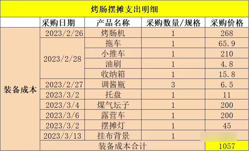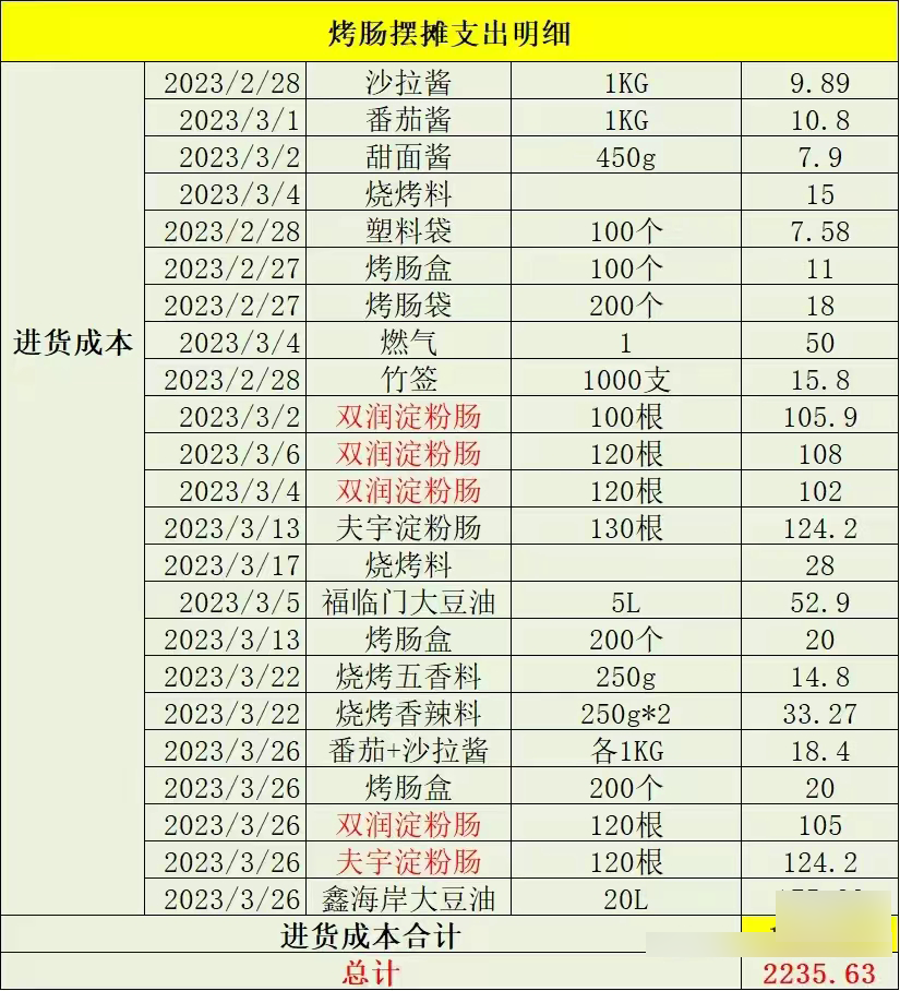 她算了笔账,从2月到3月,光是烤肠机、推车、煤气管子等设备加上烤肠、酱料、竹签等进货成本,就花了两千多,现在只想尽快回本,已经没多少赚钱的心了。