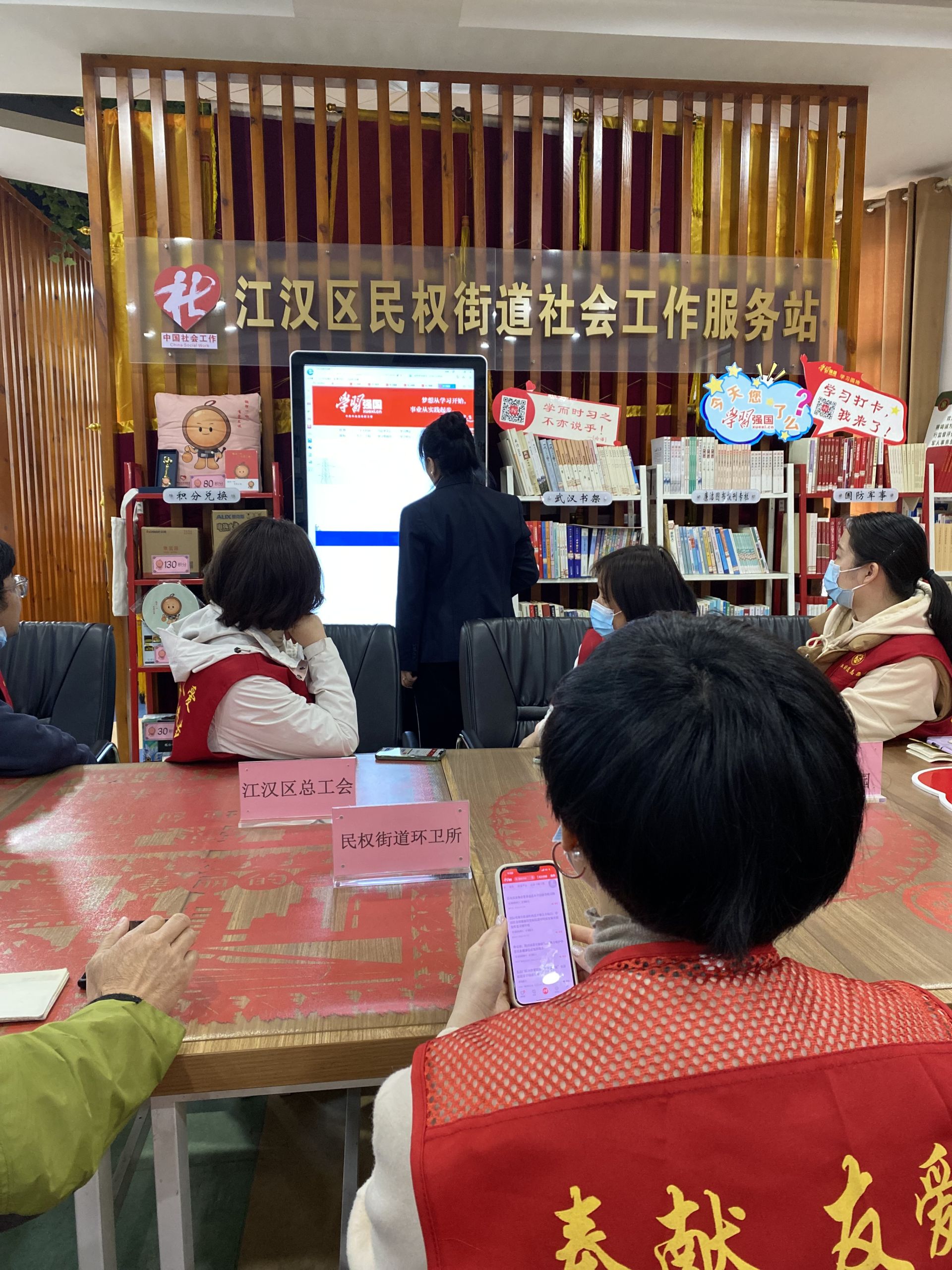 为进一步增强辖区党员运用“学习强国”APP学习体验和参与感,促进全民学习和知识分享,全面推动党的二十大精神落地生根,激发全体党员学习热情和干事激情,4月24日上午,武汉市江汉区民权街道打铜社区开展了以“‘学习强国’喊你打卡啦!”为主题的线下学习活动。武汉市司法局戒毒保障所、江汉区总工会、江汉区百灵幼儿园、民权街道环卫所等多家共建单位、下沉党员、社区工作人员共计20余人参与此次活动。