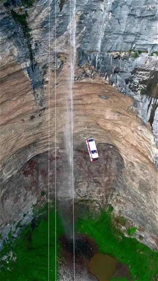近日,一段“观光车在天坑中悬浮”的视频在网络上广为流传。5月6日,极目新闻记者联系到发布该视频的恩施鹿院坪生态旅游景区负责人,其表示天坑垂直落差达500余米,视频拍摄当天景区正用索道运送新观光车,车内未坐乘客。