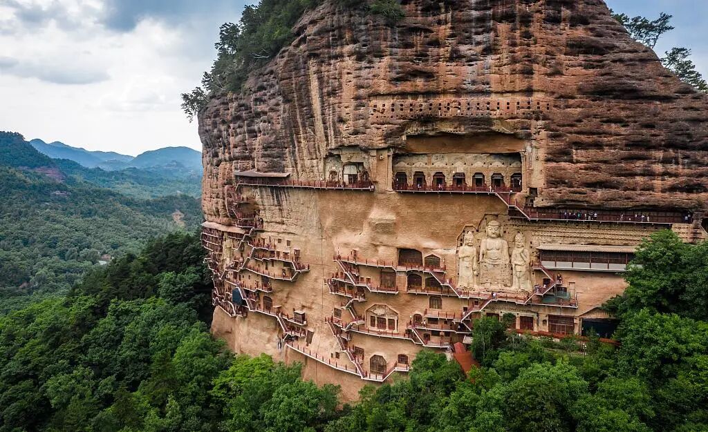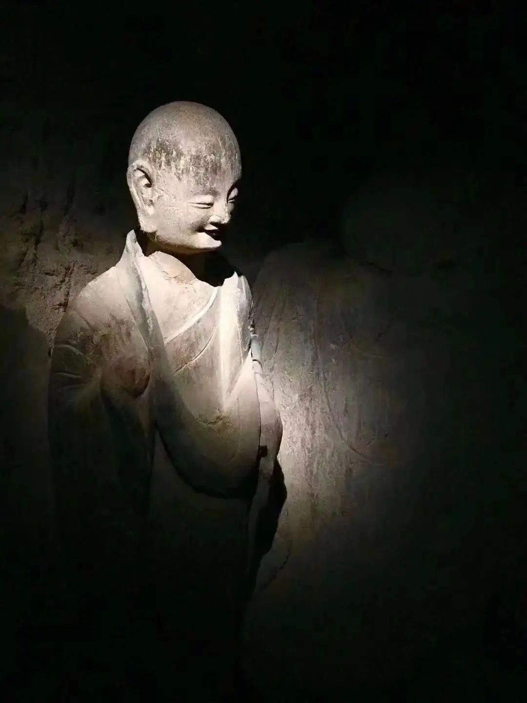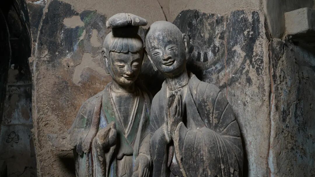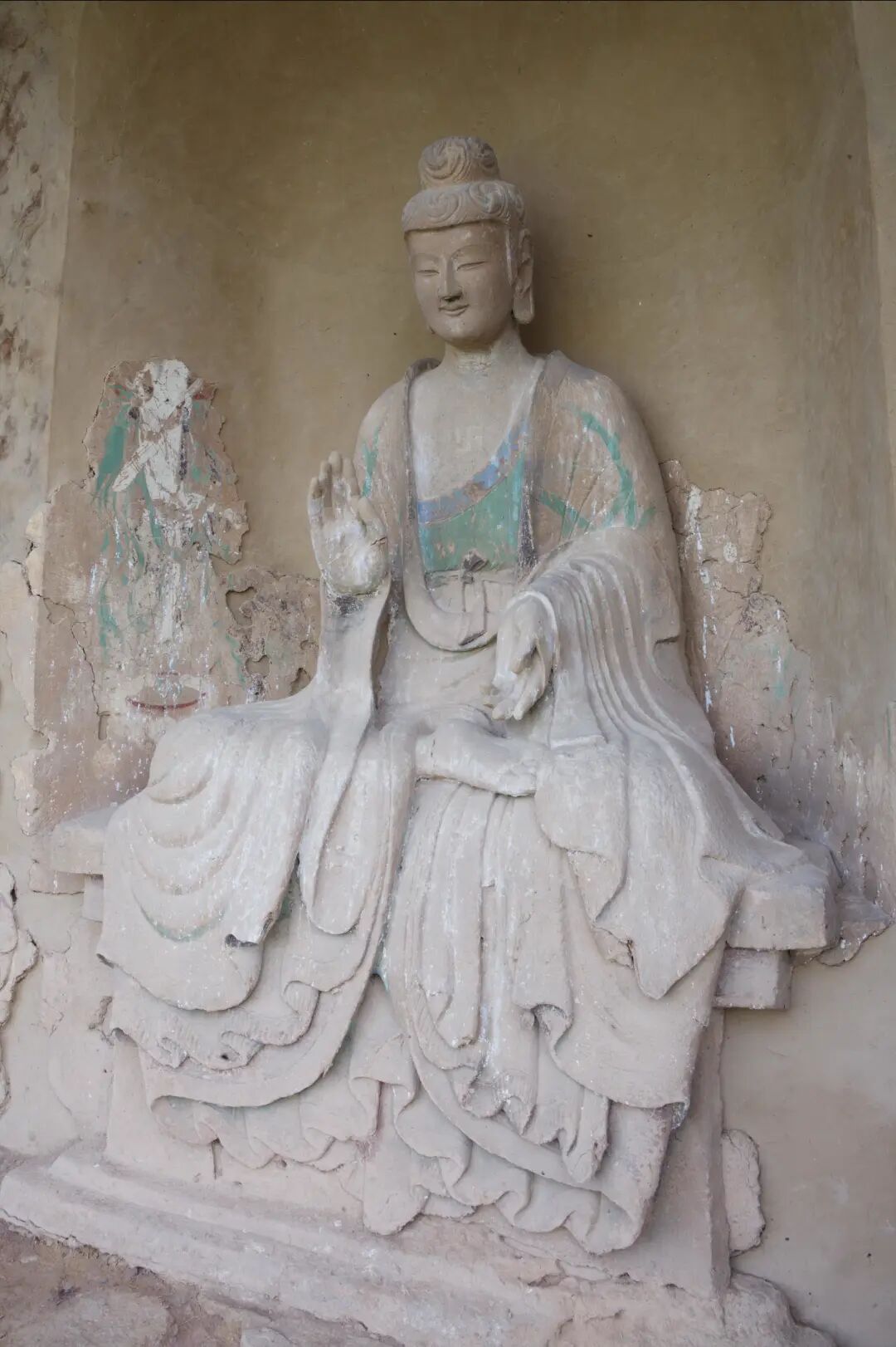 △麦积山石窟第121窟,正壁龛右侧《菩萨与弟子》彩塑。