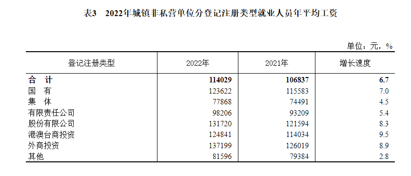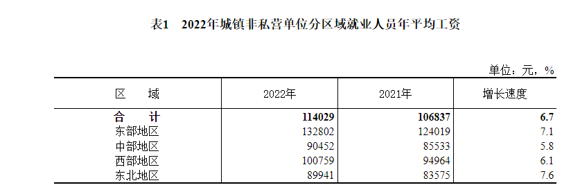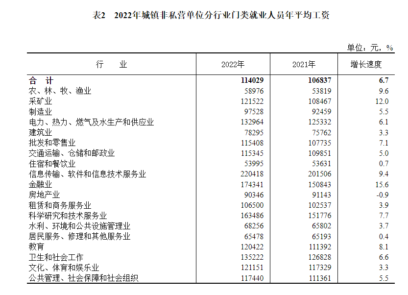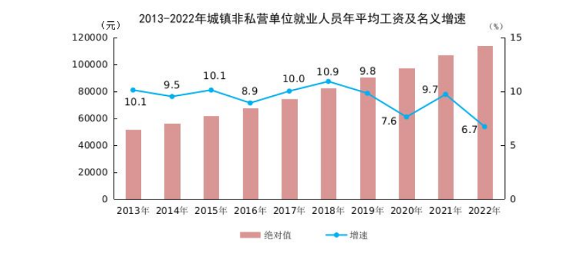 2022年全国城镇非私营单位就业人员年平均工资为114029元,比上年增加7192元,名义增长[1]6.7%。扣除价格因素,2022年全国城镇非私营单位就业人员年平均工资实际增长4.6%。