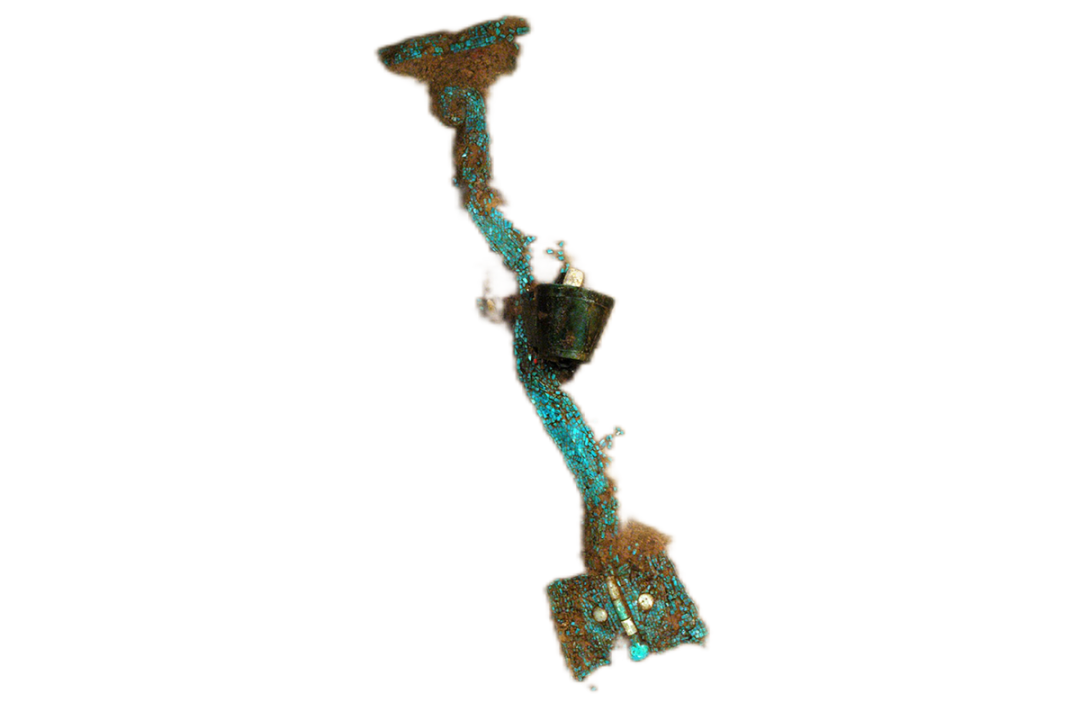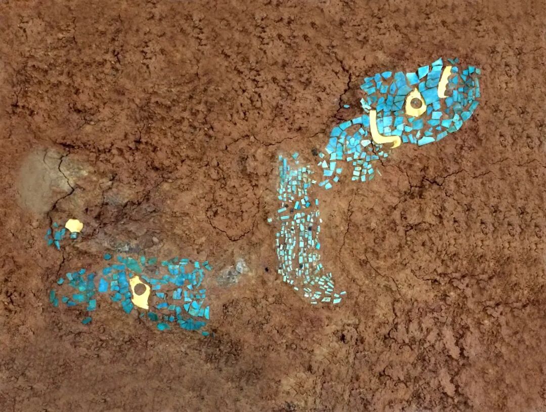初步推测这是一件兽面形器物破损后形成的两个部分,右侧部分保存较为完整。目前可见金箔片5个、绿松石片达515个。兽面部长约13厘米,残宽约5厘米,眉毛、眼睛、牙齿是由金箔片装饰而成,躯干及尾部长约10厘米,宽约2.5厘米。经检测,金箔片的含金量超过70%。这些饰片最初可能镶嵌在漆器或木器上。