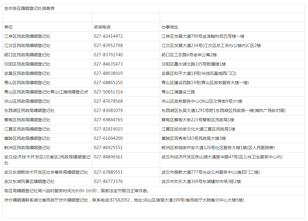 联系武汉各区婚姻登记处