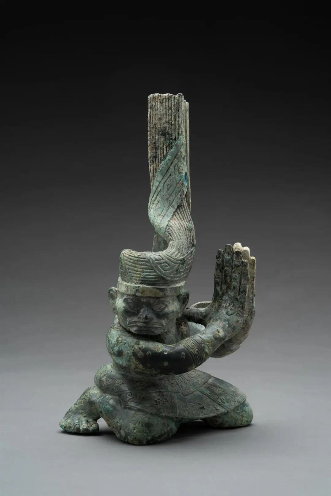 三星堆博物馆藏的“网红”文物铜扭头跪坐人像,其奇特手势被网友解读为“拒绝沟通” ;