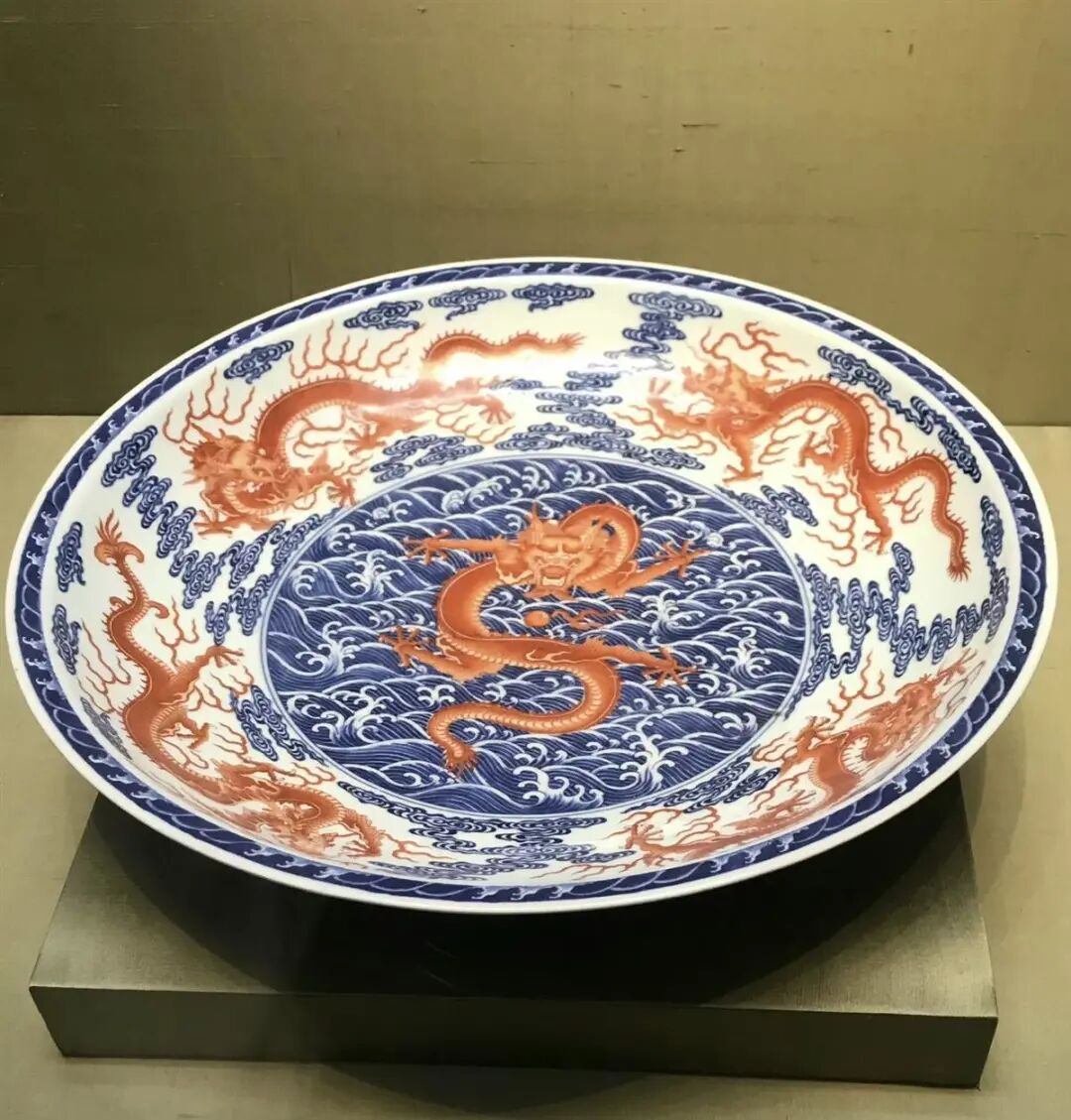 看完两个陶器,再来看瓷器。苏州博物馆藏的青花矾红海水龙纹折沿盘,乍一看就是个印有蛟龙的盘子,但奈何网友的眼睛多尖啊,放大照片后就发现,盘子上的龙仿佛在“手舞足蹈、手忙脚乱、手足无措、毛手毛脚”,“再配上龙的表情,它好像在说:你你你,你要跳舞吗?”