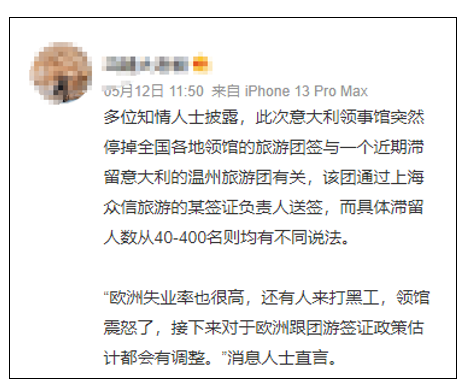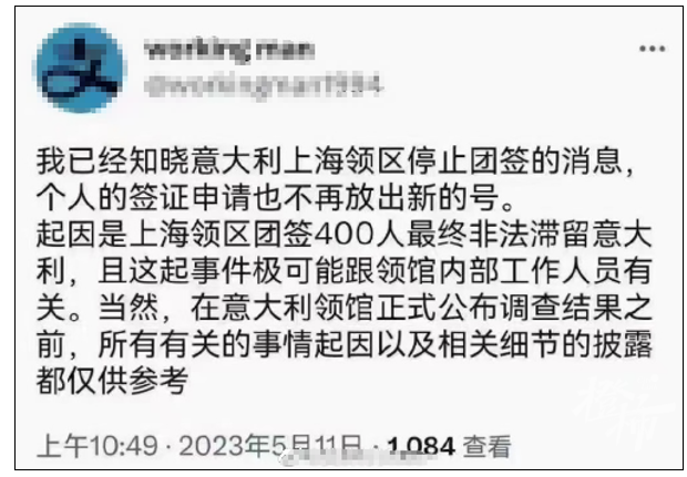 近日,有关“意大利签证暂停办理”的消息在社交网络流传,并称与一个近期非法滞留意大利的400人温州旅游团有关。