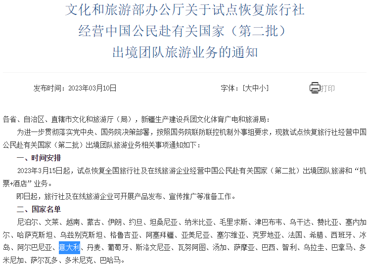 此前,文化和旅游部公布了《关于试点恢复旅行社经营中国公民赴有关国家(第二批)出境团队旅游业务的通知》。自2023年3月15日起,试点恢复全国旅行社及在线旅游企业经营中国公民赴有关国家(第二批)出境团队旅游和“机票+酒店”业务,意大利名列其中。