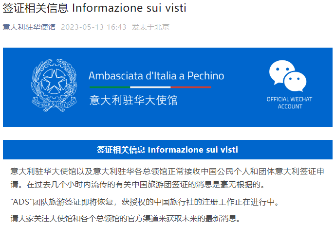 5月13日,“意大利驻华使馆”官方微信公众号发布《签证相关信息 Informazione sui visti》一文称: