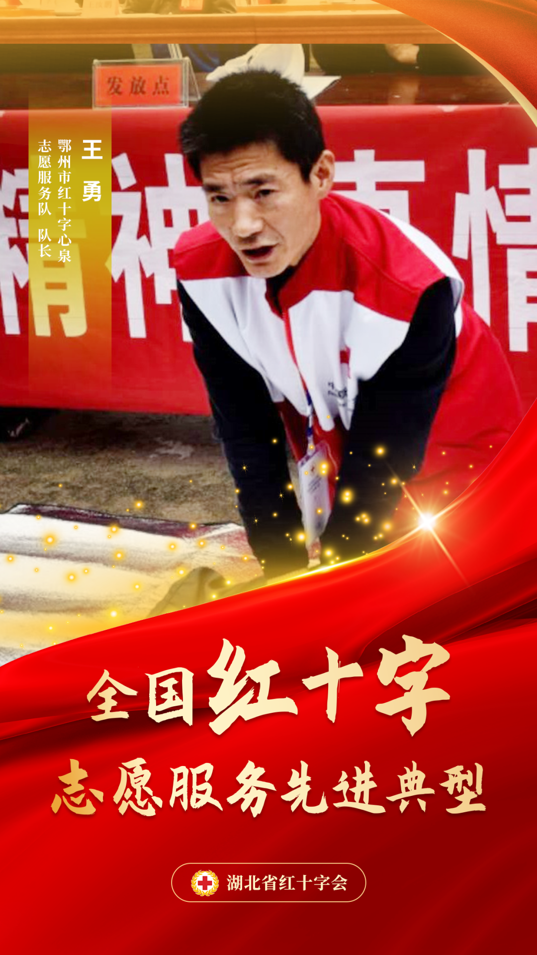 王勇,鄂州市红十字心泉志愿服务队队长,浩然基金发起人。他常年组织红十字志愿服务关爱活动,走进社区,走进特殊群体,是志愿者们眼中的“好队长”,更是社区孤寡老人眼中的“好儿子”、贫困残疾人的“好朋友”。