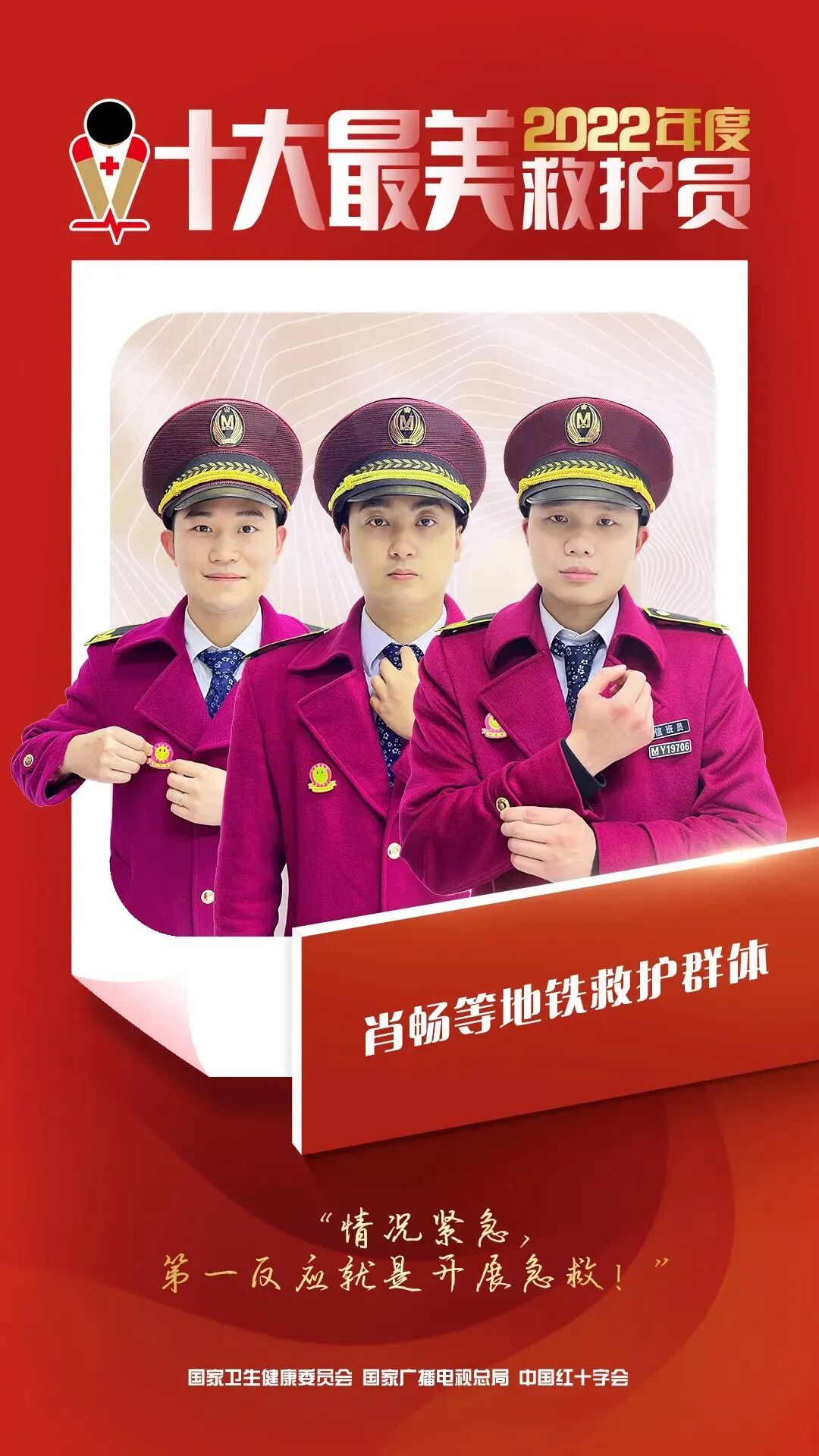 为进一步选树群众性自救互救典型人物,宣介应急救护感人事迹,中国红十字会总会、国家卫生健康委员会、国家广播电视总局在全国开展了“寻找最美救护员”宣传选树活动。近日,三部门联合发布了2022年度“十大最美救护员”名单。我省肖畅等地铁救护群体获评2022年度“十大最美救护员”让我们向这些平凡英雄致敬!