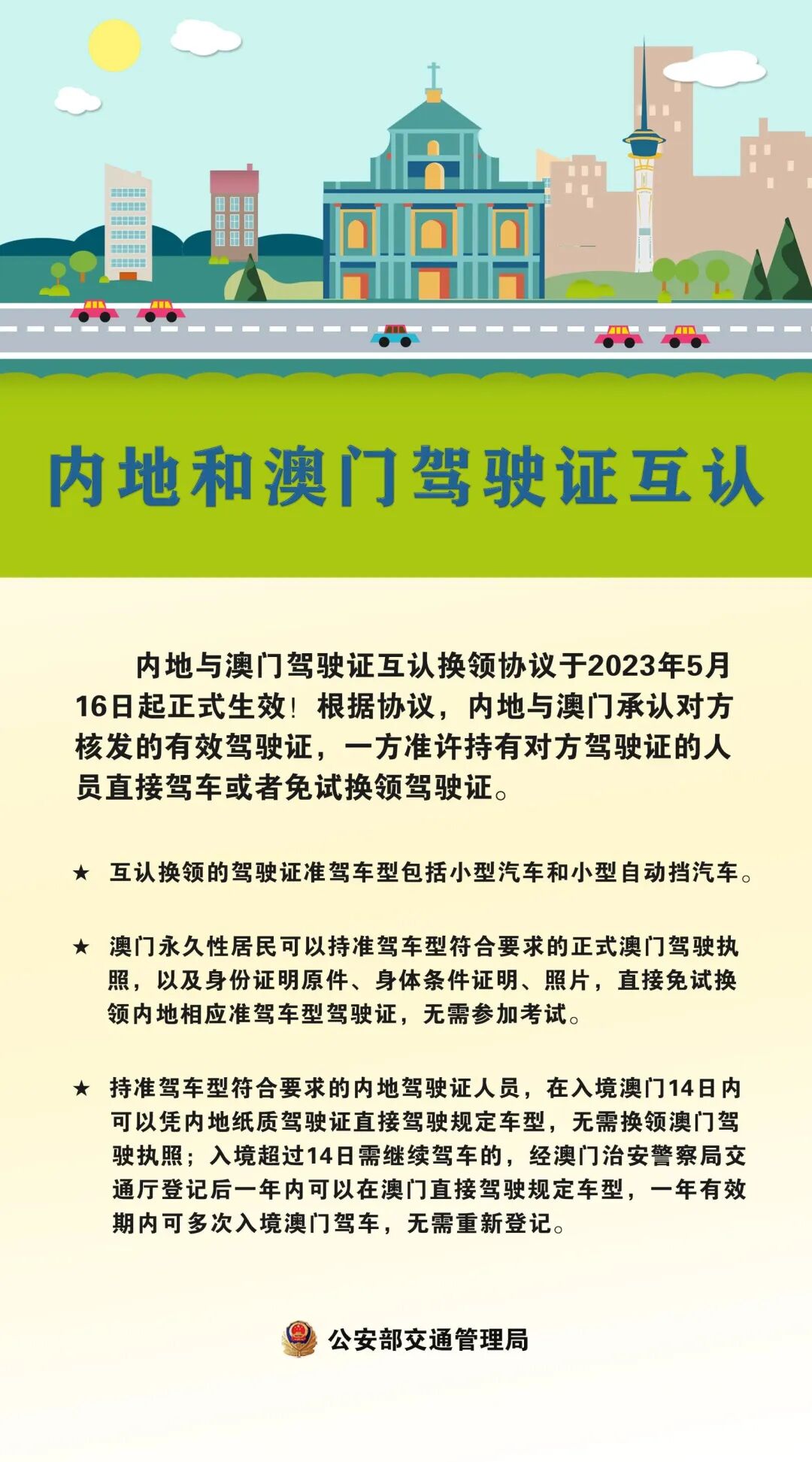 内地与澳门也实现驾驶证免试互认换领啦为更好促进粤澳两地交流发展,今年2月,公安部与澳门特别行政区政府签署《内地与澳门关于互认换领机动车驾驶证的协议》,实现内地与澳门驾驶证免试互认换领。该协议于2023年5月16日正式生效。