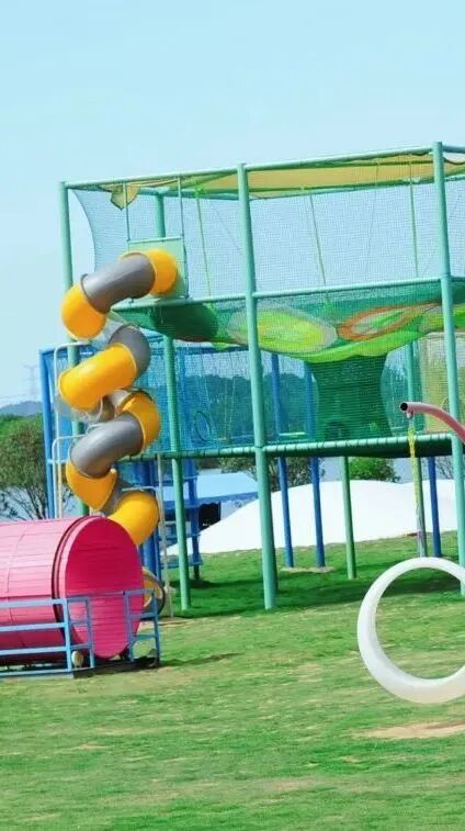 广阔的草坪上设有大大小小的无动力项目,