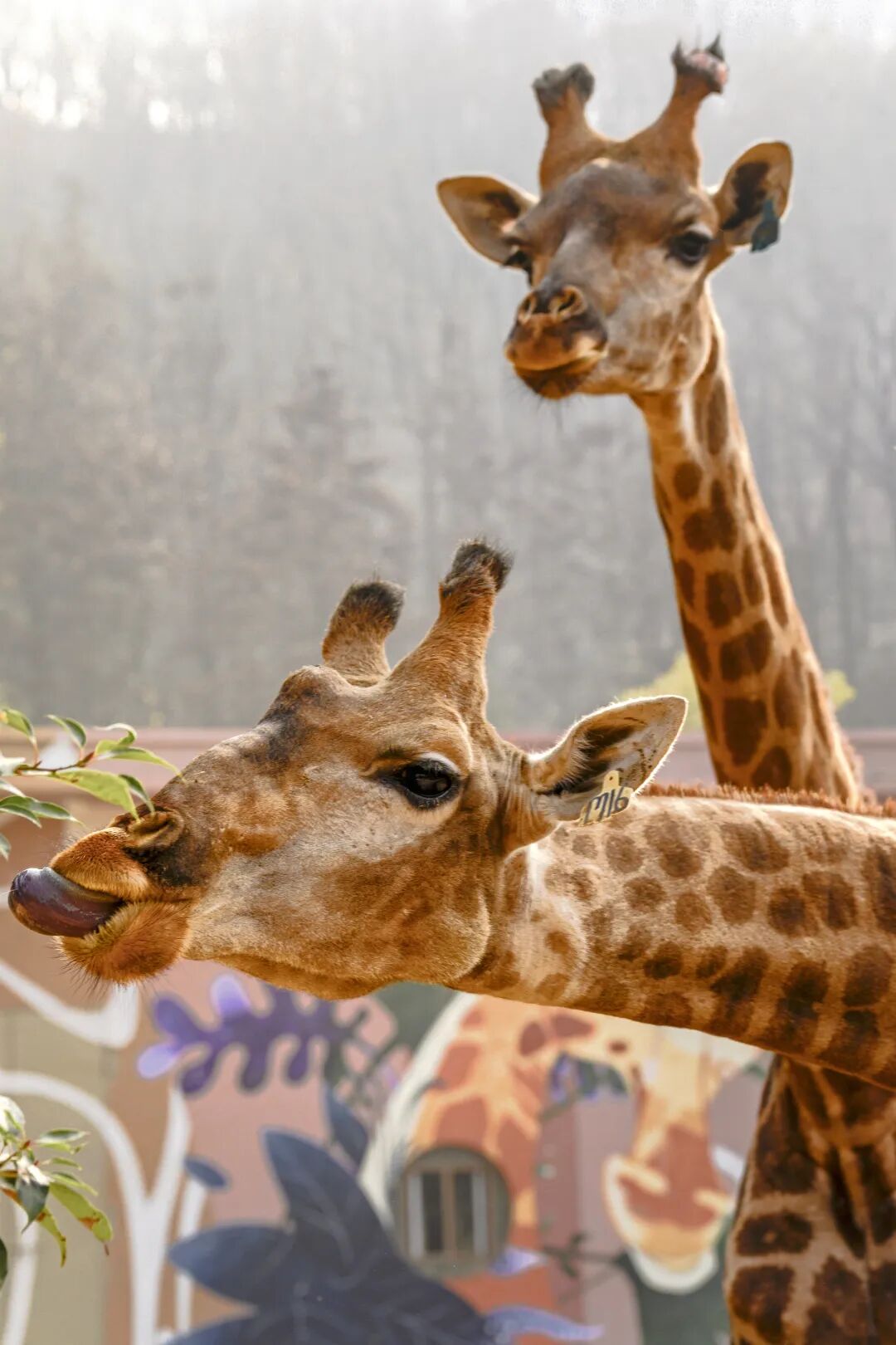 给优雅的长颈鹿喂叶子,