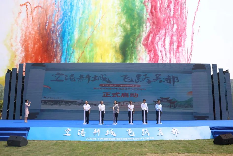 在全体人员的倒数声后,炫目的彩烟从舞台背后喷涌而出,本届空港新城 飞跃吴都2023年“5·19中国旅游日”鄂州分会场暨华中首届低空飞行嘉年华活动正式启动,市民游客齐齐鼓掌,现场其乐融融。