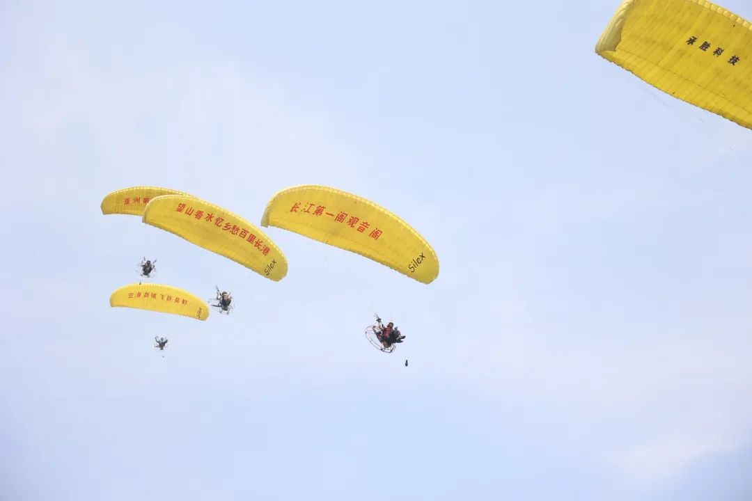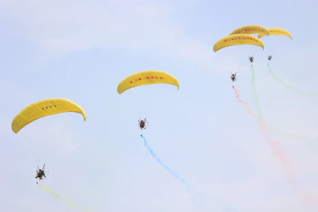 会场内,呐喊声、欢呼声此起彼伏,动力伞编队飞行,也展现出鄂州这座空港新城的空中精彩。